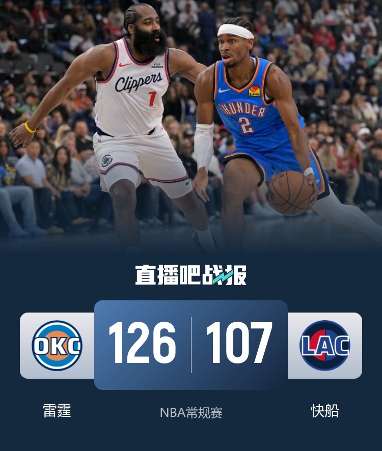 比赛上来,哈登就展示出了火热的状态,个人连中三分球包揽球队开场的前12分,在他的带领下快船建立起两位数的领先优势,次节快船的命中率明显出现下滑,雷霆把握住机会成功追上比分,半场结束时分差仅剩1分;下半场回来,雷霆的追分势头还在继续,尤其是亚历山大势不可挡,他单节狂轰18分5助攻,三节结束时快船已经被反超8分,不过多特因肩膀伤势提前退赛,末节快船似乎失去了抵抗之力,雷霆再轰一波11-0直接将分差拉开到两位数,比赛就此失去悬念,亚历山大末节也没有再出场,最终雷霆轻取快船迎来开季八连胜。