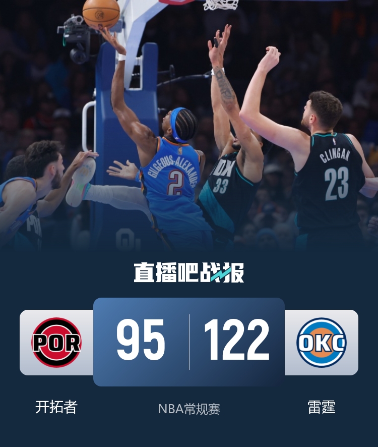 11月24日讯 NBA常规赛今日继续开打,联盟领头羊雷霆坐镇主场迎战开拓者,杨瀚森本场继续替补待命。开拓者上一场力克勇士结束4连败,雷霆则豪取8连胜一骑绝尘。