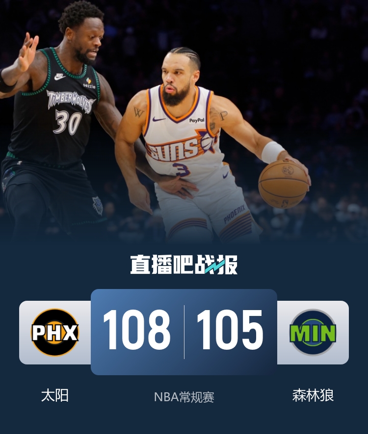 比赛上来,太阳率先进入状态连拿6分取得领先,整个第一节森林狼都处于落后,次节两队开始展开对攻,森林狼虽然一直紧咬比分,但始终无法完成反超,爱德华兹半场就轰下21分,半场结束时太阳仍领先4分;下半场回来,森林狼终于抹平分差,之后两队继续保持拉锯,直到最后时刻才分出胜负,关键时刻爱德华兹上篮追到1分,吉莱斯皮两罚全中,麦丹和里德相继绝平三分不中,最终太阳险胜森林狼终结后者五连胜。